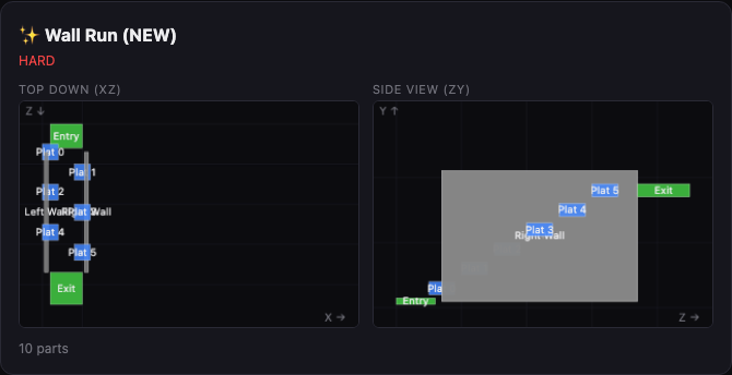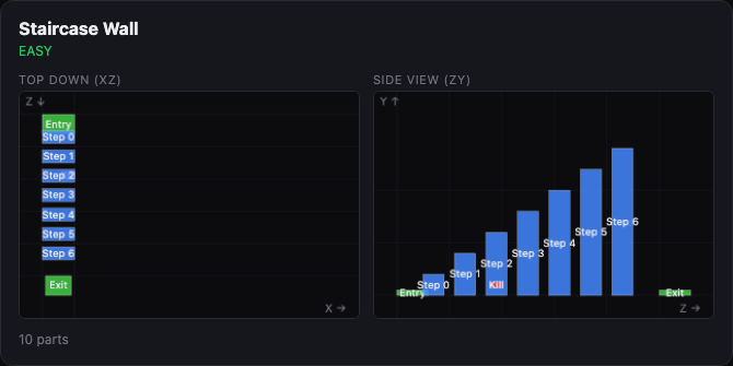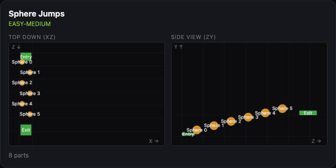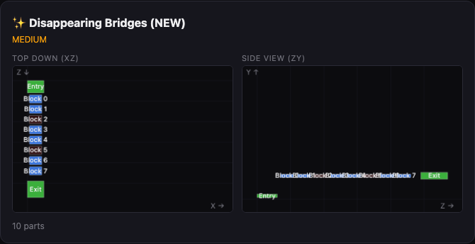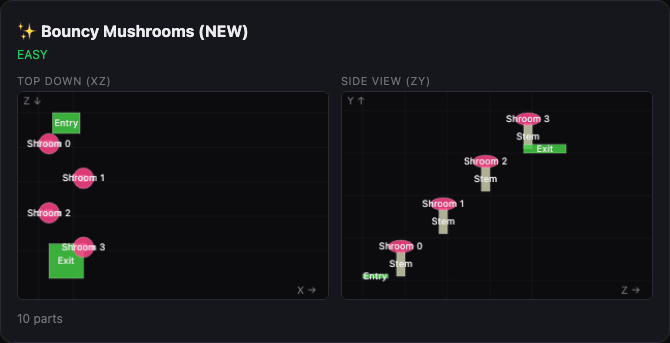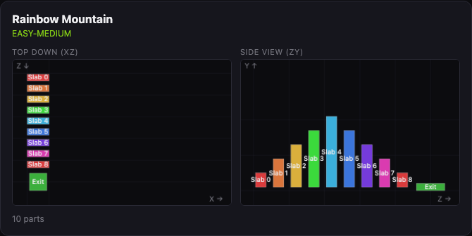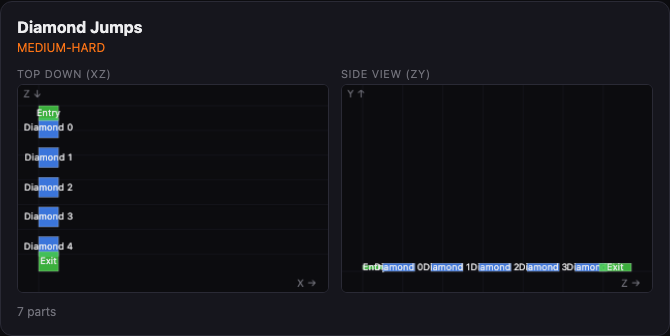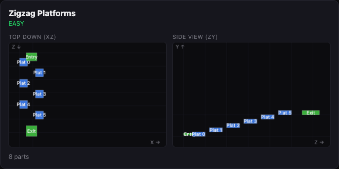 EasyA zigzag sequence of small, medium, and plank platforms with varying gaps. The bread-and-butter precision jumping section found in every obby.