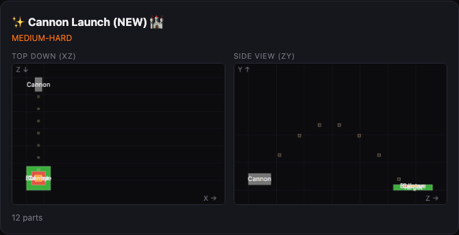 HardA cannon that launches players in a ballistic arc across a 50-stud gap to a bullseye target platform. Miss the target and you fall.