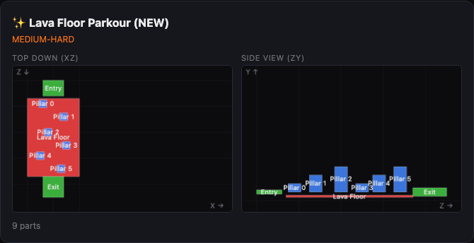 PromptBlox builds obbies from a library of 23 procedurally generated obstacle types — each one produces a unique section every time. You can mention specific obstacles in your prompt to include them, or let the AI pick a mix based on your theme and difficulty preference.