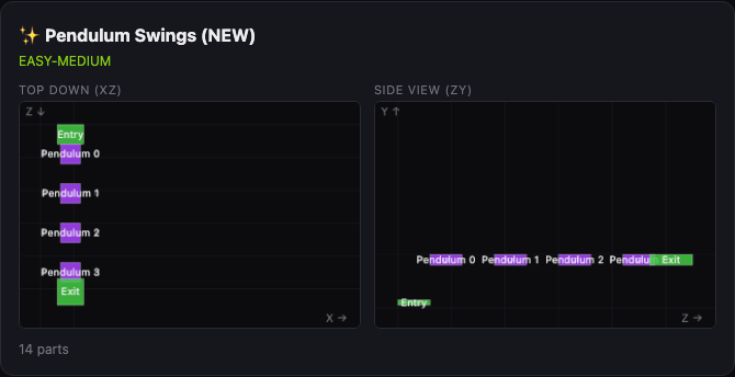 HardPlatforms that swing side to side like pendulums. Players must time their jumps to land on a platform mid-swing.