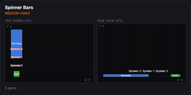HardA runway with 2-3 rotating kill-brick bars. Players must time their run through gaps in the spinning bars — get hit and you die.