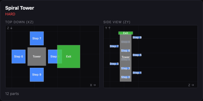 MediumA tall central tower with platforms spiraling up the outside at 90-degree steps. Players climb 10 levels to reach the top.