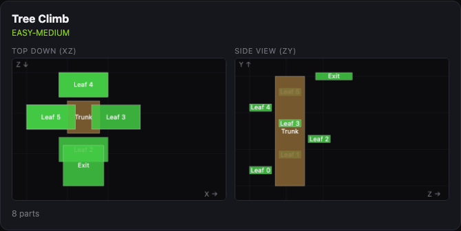 MediumA tall central trunk with leaf platforms spiraling upward at 90-degree intervals. Players spiral around the tree to reach the top.